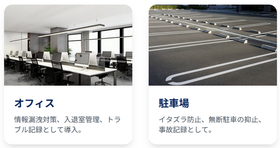 - 一般オフィス: 従業員の安全確保と機密情報の保護に。